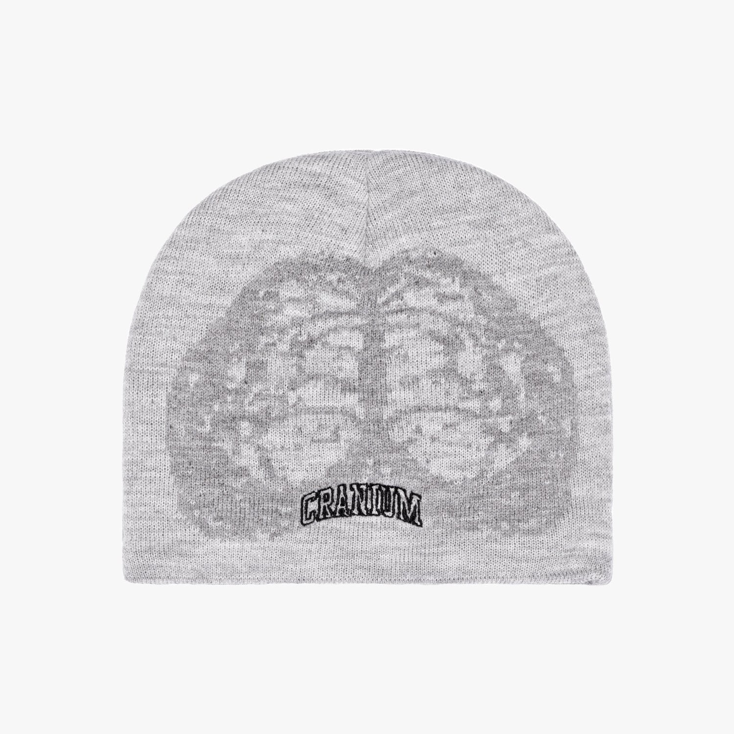 Knit beanie with jacquard graphic on both sides. Embroidered logo detail on front.